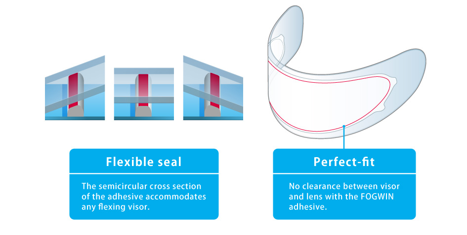 To prevent fogging at the edge of the seal, FOGWIN uses a high-performance adhesive that accommodates any flexing visor. The semicircular cross section of the adhesive accommodates any flexing visor, therefore, there’s no clearance between visor and lens with the FOGWIN adhesive.