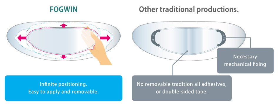 The FOGWIN does not use any mechanical fixing. The FOGWIN special adhesive extends the life of anti-fogging performance.